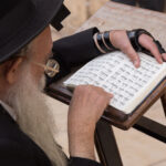 An elderly Orthodox Jew wears tefillin as he reads the Torah in front of the Western Wall in the Old City of Jerusalem. Photo by Max Power
